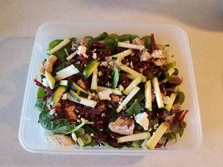 I was craving Salmon when this salad came to life. I don’t know about you but when I have a craving if I don’t do something to satisfy it I will eat a bunch of other things in order to satisfy it. In the end, I will be stuffed, uncomfortable and maybe bloated. With time I have learned that eating a little of what my body is asking for works out far better. This could be textures, flavors or a specific item. I find these days when I crave sugar I can put a naturally sugar dense vegetable in a salad and be quite content. It has taken me a bit of experimenting to get to this point. Enjoy this creation of mine and have a beautiful day – whatever that means to you. This is one of the ways I enjoy sending love out into the world. Rock on!